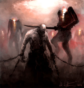 “Όλα έγιναν στην εντέλεια Σεβασμιότατε. Η Μαύρη Επισκοπή παραδόθηκε στις φλόγες του Ήφαιστου και στο σπαθί του Άρη!” Ο αλυσοδεμένος, αιμόφυρτος Philemon σηκώνει το βλέμα του αψηφώντας τις συνθήκες: “Αμαρτωλοί και βλάσφημοι, πως τολμάτε να μεταχειρίζεστε έτσι τον ποιμένα της Lancea et Sanctum! Ο άγιος Longinus...”