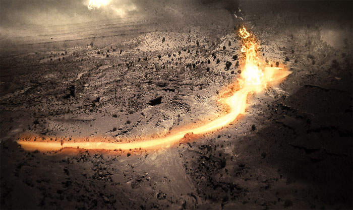 Βλέπει ένα τοπίο σκοτεινό σε τόνους του μαύρου και γκρι, άδειο από ζωή, αέρηδες να μαστιγώνουν με τόνους στάχτης ερείπια και ξεχασμένους σκελετούς.